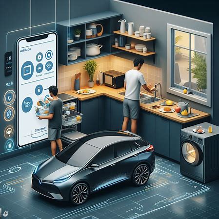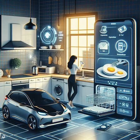 Can you create a futuristic image of a smart home with connected appliances, car, and phone? Imagine this: you finish your omelet and put the dishes in the dishwasher. As soon as the dishwasher is full, your car starts automatically. This is because your smart home system analyzes your habits and suggests the best time to start your car. The image should have a sleek style, like a consumer goods commercial.
